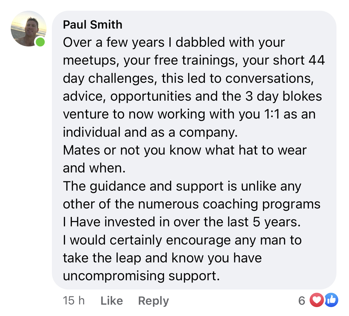 As a Mindfit man, you receive a seat at the 3-day BlokesVenture retreat — our immersive, in-person initiation experience on the Sunshine Coast, Qld